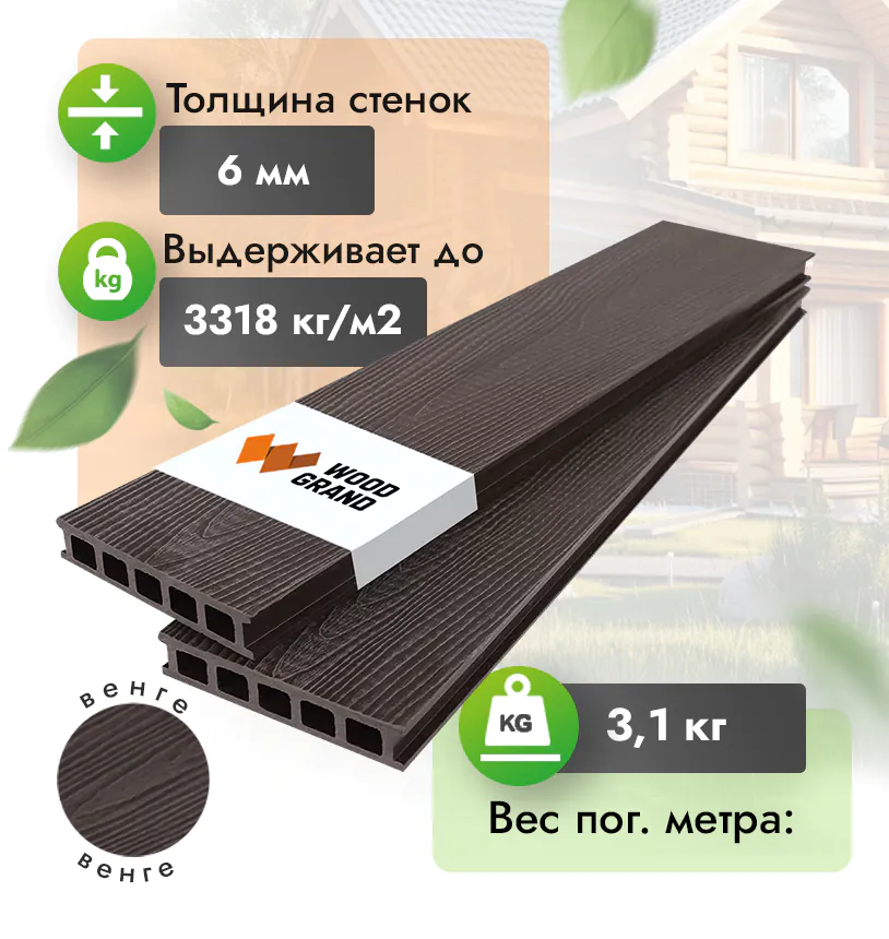 Наша террасная доска из ДПК выдерживает до 3318 кг/м2, влагостойкая, не требует ухода.